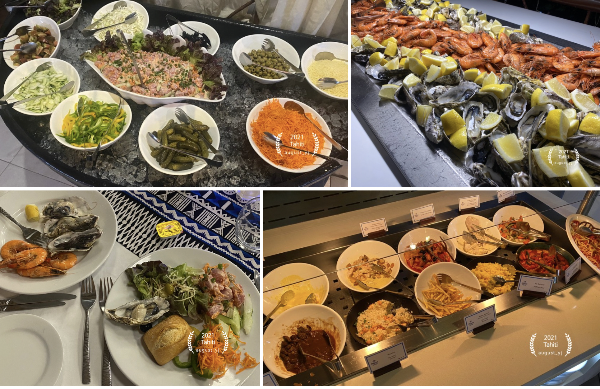 폴리네시안 전통춤 공연과 함께 하는 디너부페는 월/수/금/토 (맞나? 여하튼 격일제) 오픈이라 떠나기 전 날 저녁인 월요일에 먹기로 했다. 자리 예약은 따로 안되는지라 시작 시간에 맞춰 일찌감치 갔고 6:30에 부페 시작, 7:30쯤에 공연이 시작해 한시간동안 이어진 것 같다. 전반적으로 음식은 그냥, 쏘쏘. 인당 9500프랑이라는 가격을 생각하면 만족스럽지 못한 맛이었지만 전통춤 공연관람비라 생각하며 또 한국에선 노로바이러스 걱정으로 맘껏 먹지 못했던 생굴을 실컷 먹었다는 것에 의의를 두었다. (초장을 몹시 그리워하며)